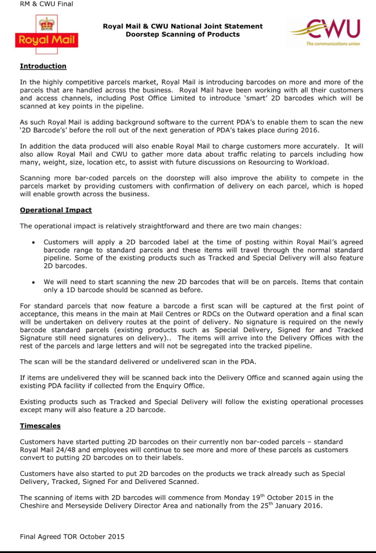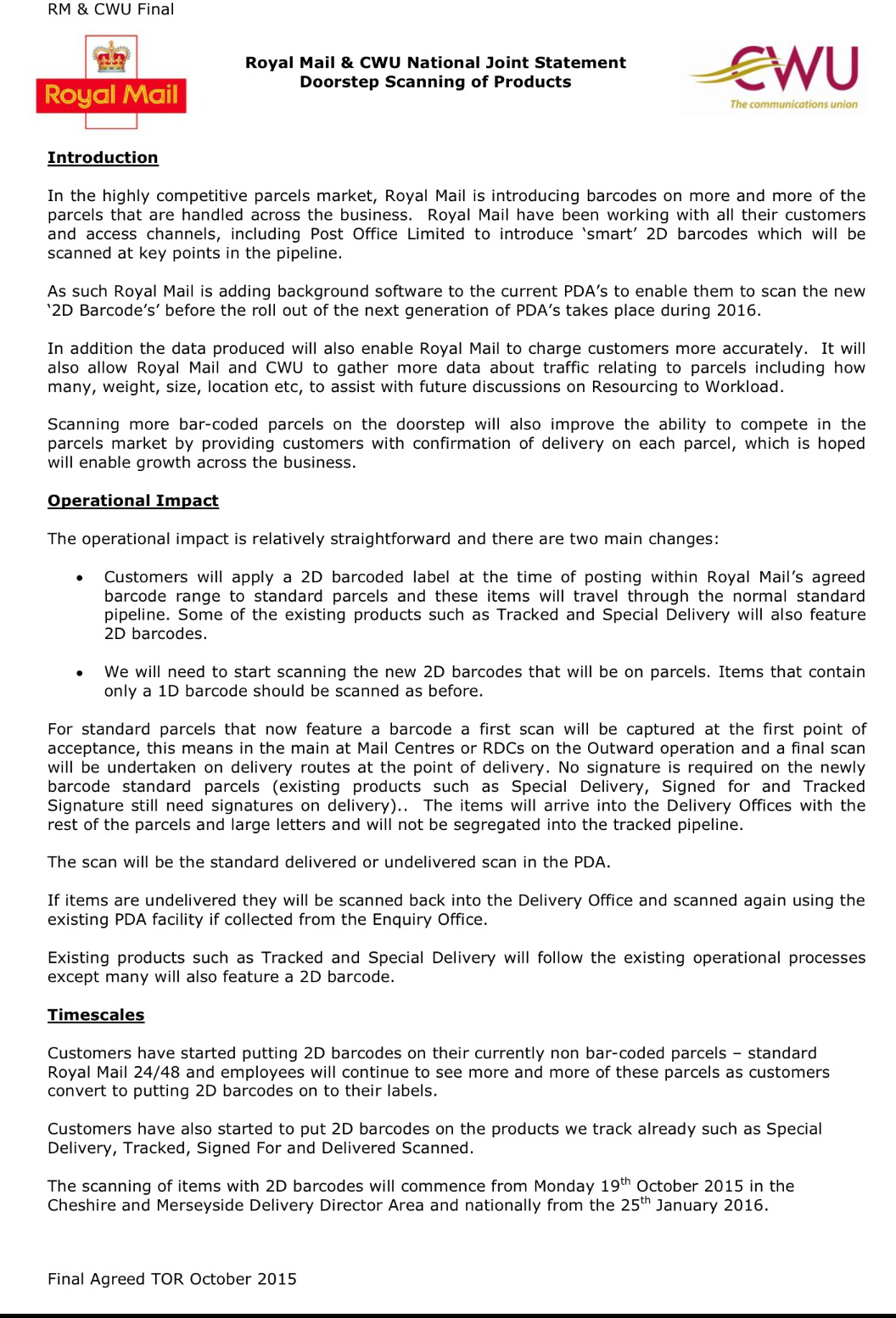 This agreement covers the Processing Function at the Peterborough Mail Centre – Christmas 2015 and New Year 2016 – between the CWU and Royal Mail.