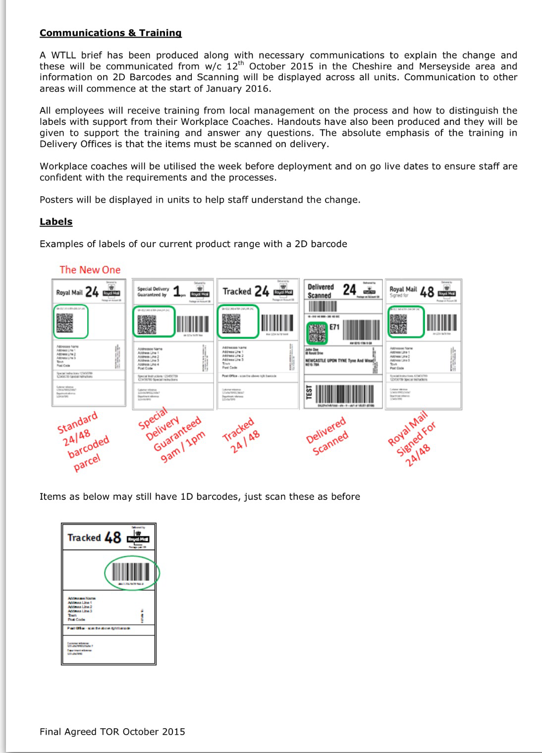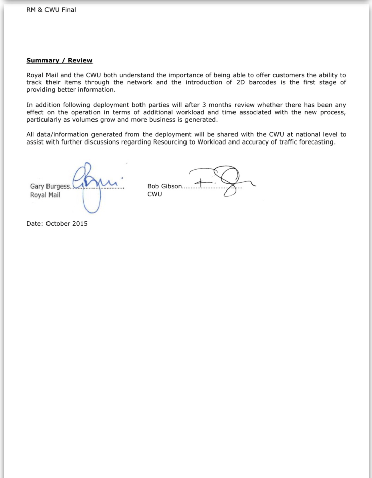 The 2015 Royal Mail and CWU locally agreed Processing Christmas Agreement