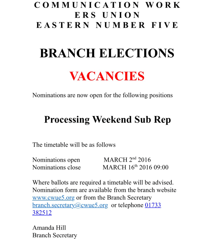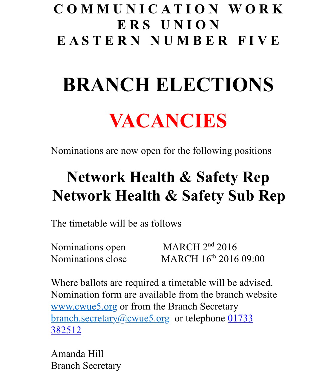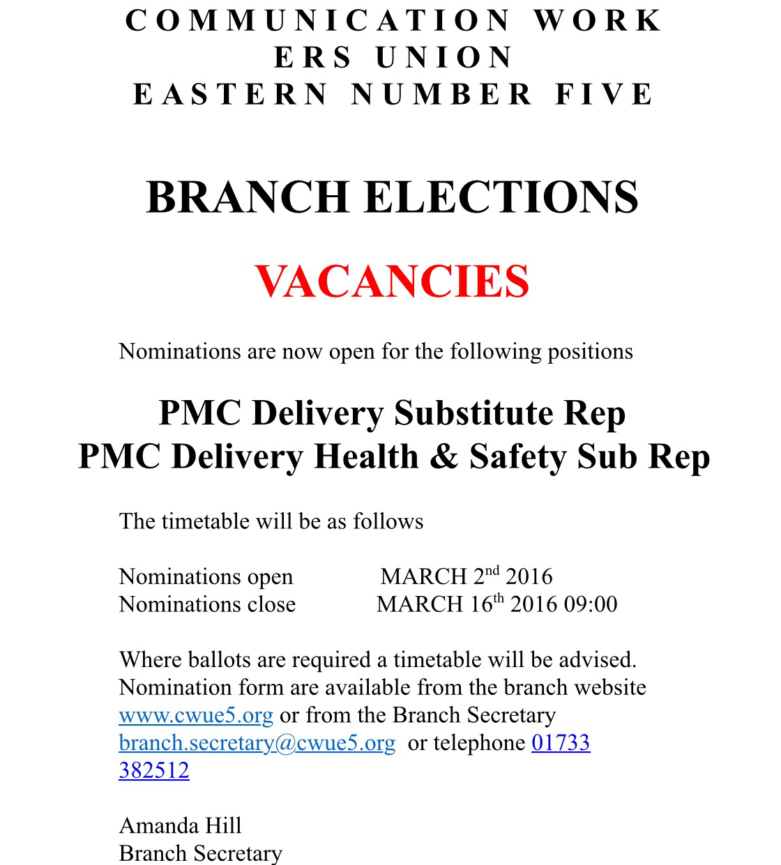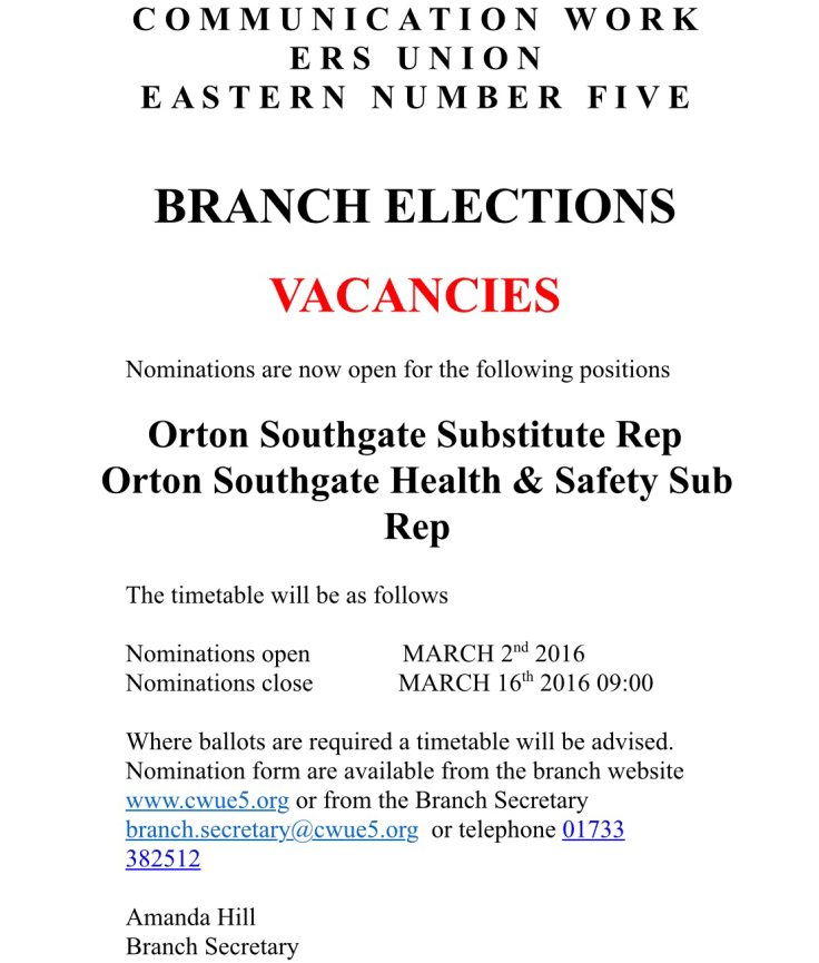 BRANCH ELECTIONS VACANCIES Nominations openMARCH 2nd 2016Nominations closeMARCH 16th 2016 09:00 1/2 Click to download a nomination form BRANCH NOMINATION FORM Share this with your friendsTweet Click to print (Opens in new window) Print Click to email a link to a friend (Opens in new window) Email Click to share on WhatsApp (Opens in new window) WhatsApp Click to share on Bluesky (Opens in new window) Bluesky Like Loading... Related Leave a comment Cancel reply Δ