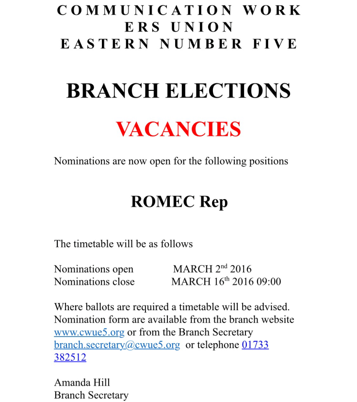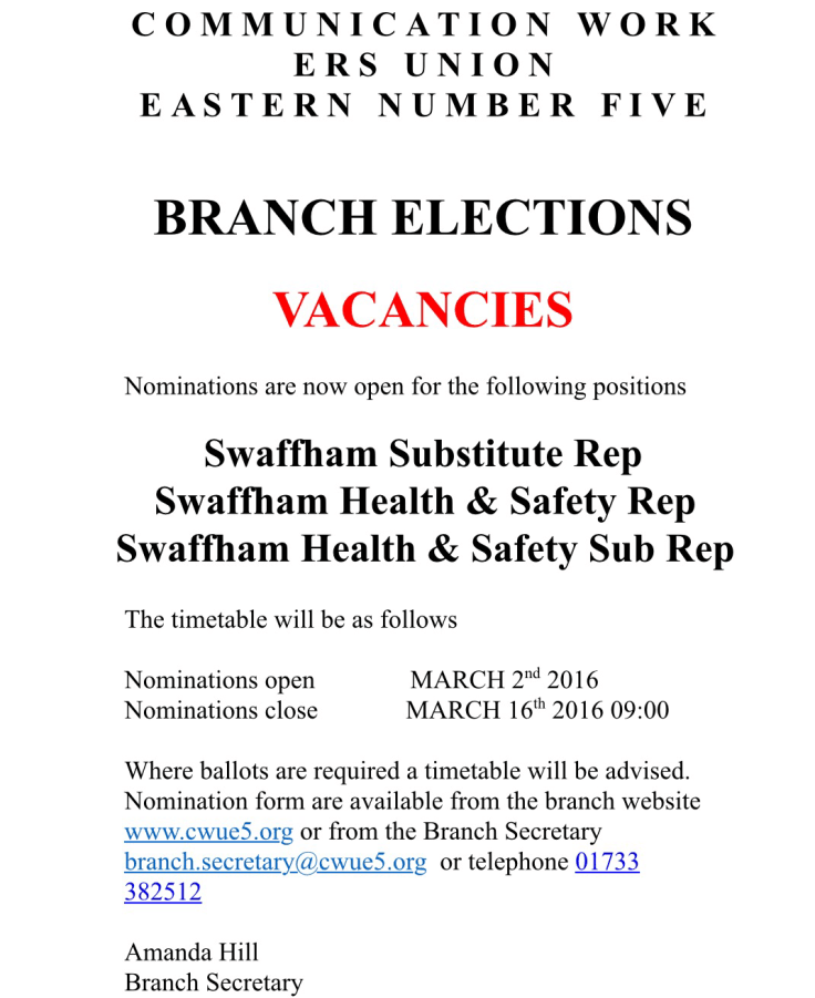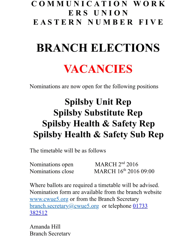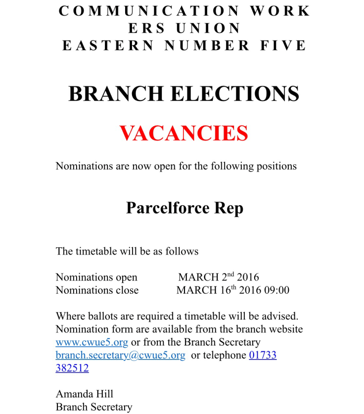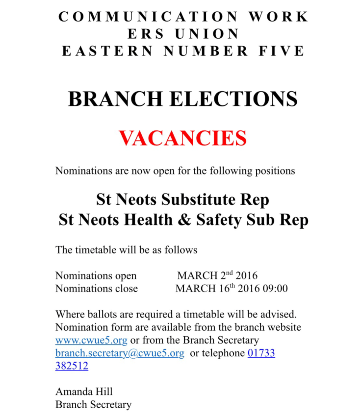 BRANCH ELECTIONS VACANCIES Nominations openMARCH 2nd 2016Nominations closeMARCH 16th 2016 09:00 1/2 Click to download a nomination form BRANCH NOMINATION FORM Share this with your friendsTweet Click to print (Opens in new window) Print Click to email a link to a friend (Opens in new window) Email Click to share on WhatsApp (Opens in new window) WhatsApp Click to share on Bluesky (Opens in new window) Bluesky Like Loading... Related Leave a comment Cancel reply Δ