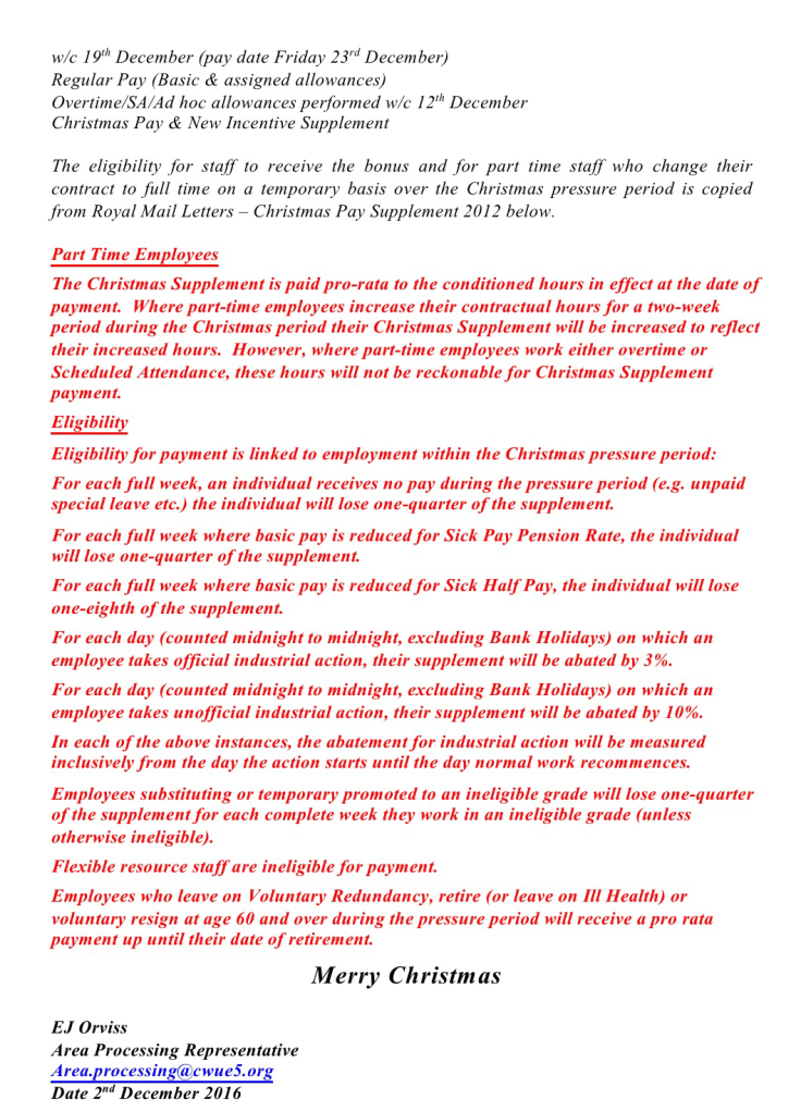 Branches and representatives are informed that rather than providing the usual managerial voluntary assistance in Callers Offices or Parcel deliveries in the run up to Christmas, the Royal Mail Industrial Engineering team have been asked to provide support in all Mail Centres, RDC’s and Parcel Sort Centres. This will entail visiting various sites and shifts and helping the plant manager and their teams deliver an efficient Christmas operation, looking at processes, layouts etc. that have been set up especially for the Christmas period.
