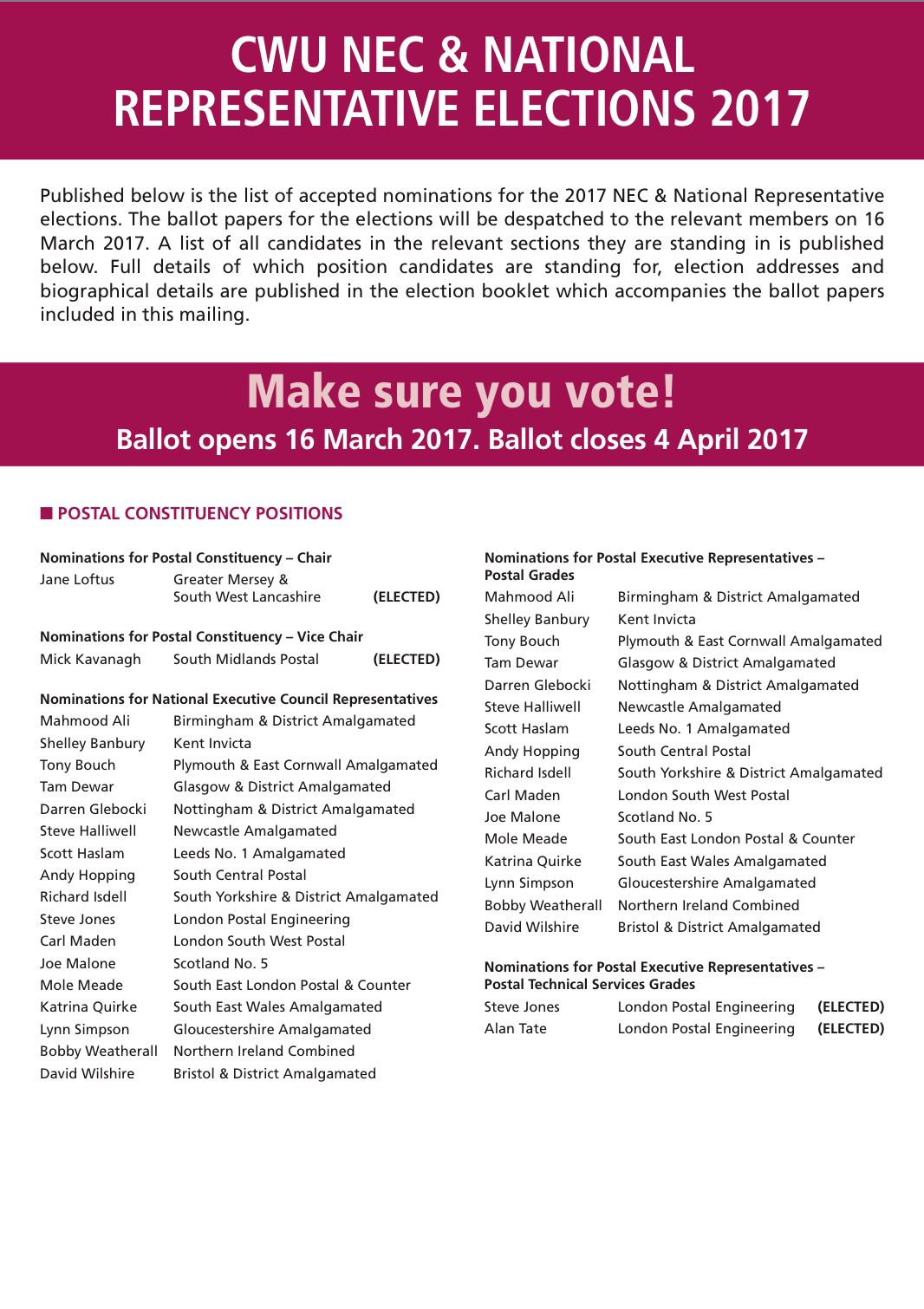 All Postal Grade members of the Postal Constituency are entitled to vote in this ballot and there are 16 candidates listed on the voting paper. Please note that members of the Postal Constituency who are PTS grades will not be eligible to vote in this ballot.