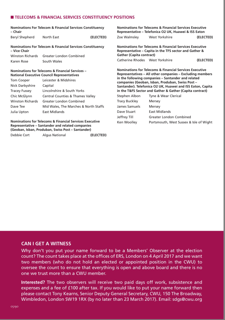 All members of the T&FS Constituency (excluding those members in the Santander and related companies, Geoban, Isban, Produban, Swiss Post – Santander, Telefonica O2 UK, Huawei and ISS Eaton, Capita in the TFS Sector and Gather & Gather (Capita contract)) are entitled to vote in this ballot and there are 6 candidates listed on the voting paper.