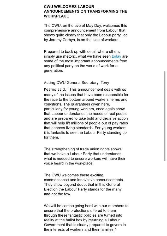 In relation to the manifesto, the union is engaging with the Labour Party on our key priorities for this. As an affiliated union the CWU has a formal role in the development of the manifesto under the Labour Party rule book, the National Policy Forum and through Labour’s NEC on which Andy Kerr (Deputy General Secretary T&FS) represents the CWU. This engagement is being managed by the union nationally within the General Secretary’s department and the primary issues we are looking to move forward reflect our major campaigns and policies on our industries.
