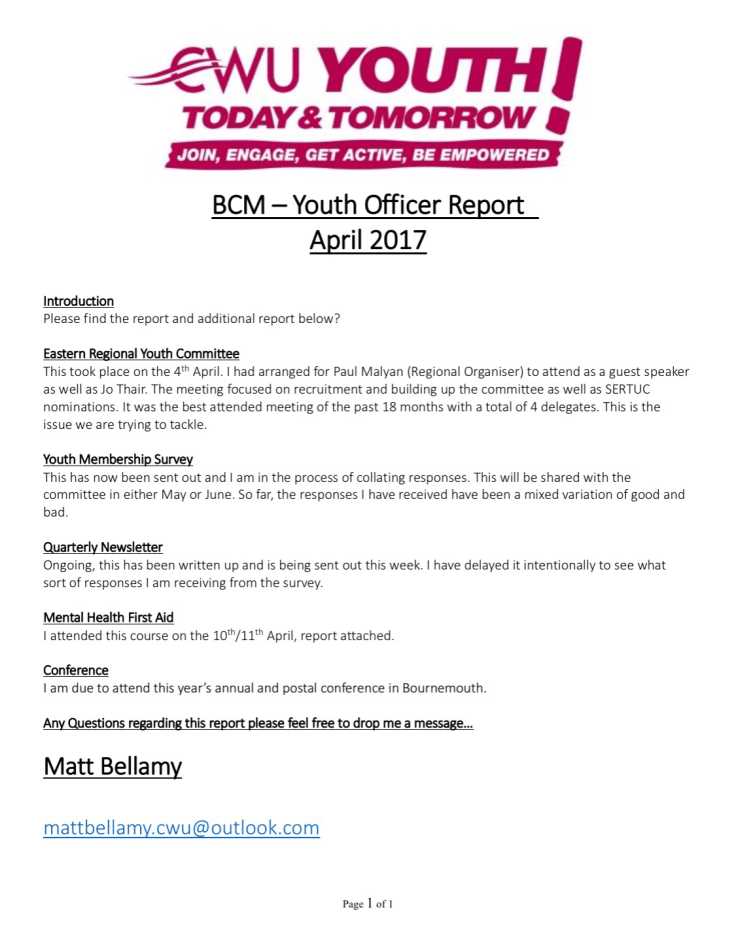 BCM – Youth Officer Report April 2017 Share this with your friendsTweet Click to print (Opens in new window) Print Click to email a link to a friend (Opens in new window) Email Click to share on WhatsApp (Opens in new window) WhatsApp Click to share on Bluesky (Opens in new window) Bluesky Like Loading... Related Leave a comment Cancel reply Δ