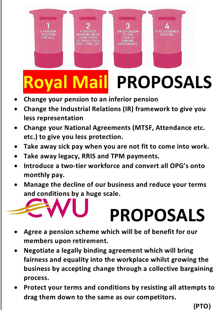 Next week Branches will receive copies of an A5 leaflet (summarising the CWU’s key arguments) for distribution to all members in all units. In addition, Branches will be sent A3 posters for circulation and display in as many Royal Mail workplaces as possible.
