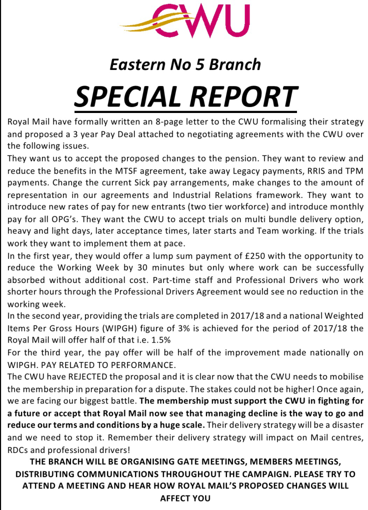 Today Saturday 27th May 2017 members of the CWU Eastern No5 Branch will start to receive a home posting laying out some of the issues that lie ahead. We ask you all to read it and please support your union to prevent the companies agenda of wanting race to the bottom on your terms and conditions .