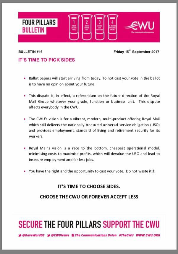 Royal Mail will this morning be asking members to hold onto their ballot paper for a few days until they receive more information from the company on pensions and other matters. This is a deliberate attempt to impact on our turnout.