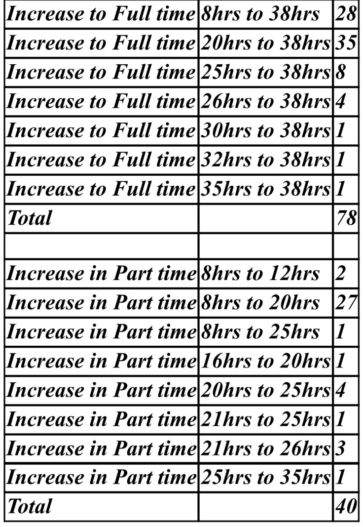 We have now completed the picking process for the re-alignment and introduction of new permanent processing duties. We went through three rounds of picks where some current full-time staff were successful in changing their work areas and shifts. More importantly and the main object of the exercise was for all staff who were on temporary full-time contracts were successful in picking a permanent full–time contract and a lot of part-time staff where successful in increasing their contractual hours. All in all, there was one hundred and eighteen staff who increased their contractual hours which has been an amazing achievement within the current climate of a privatised company. The details of the successful uplifts of contract are below: