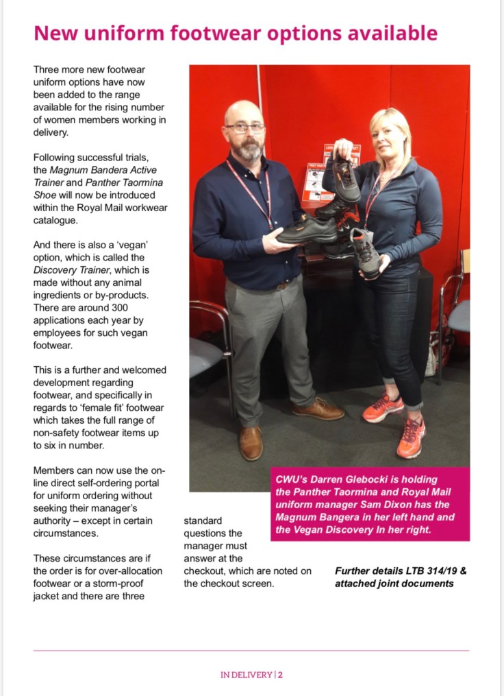 At our very constructive meeting, we discussed both long-term plans in relation to the need to make improvements to the uniform fabrics in relation to the provision of UV protection and also at the same time provide clothing that will cover up the whole body but still provide breathable, lightweight and cool clothing. We need to continue those discussions in conjunction with the National Uniform Manager, Royal Mail Assets and Procurement and our suppliers, currently Dimensions.