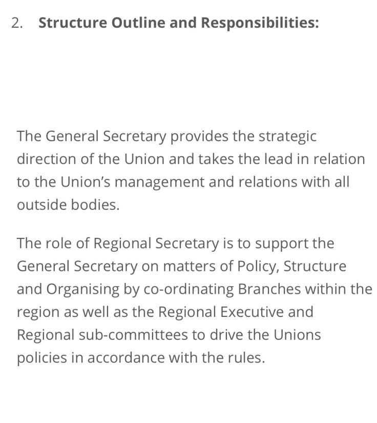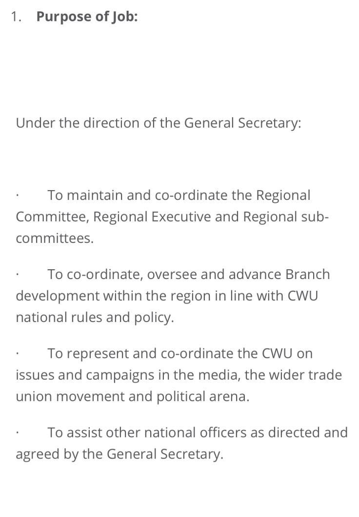 The Regional Secretary shall be the principal representative of CWU Headquarters in the Region and shall co-ordinate all activity in the Region. The roles and responsibilities of the Regional Secretary, as agreed by the NEC, are attached as Appendix A.