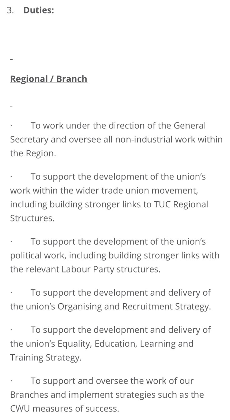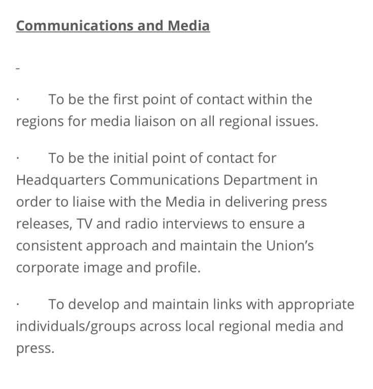 Additionally the Assistant Regional Secretary will support the Regional Secretary and be the lead Regional Representative on Communications and Campaigns.