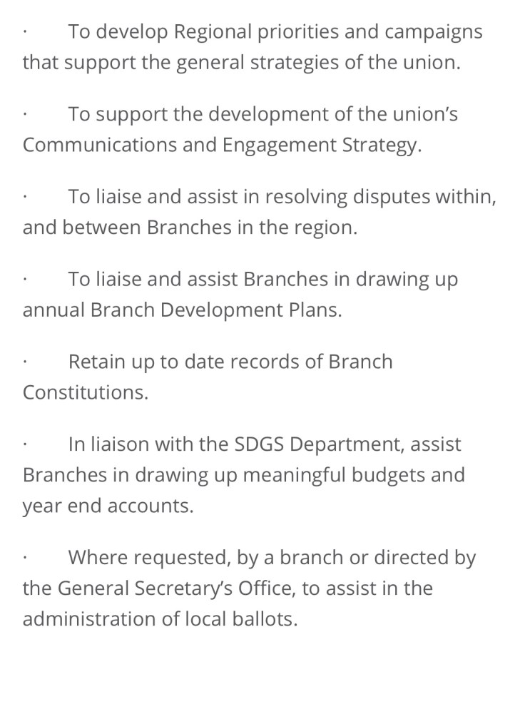 The duties of the Regional Officers shall be detailed within the Regional Committee Constitution