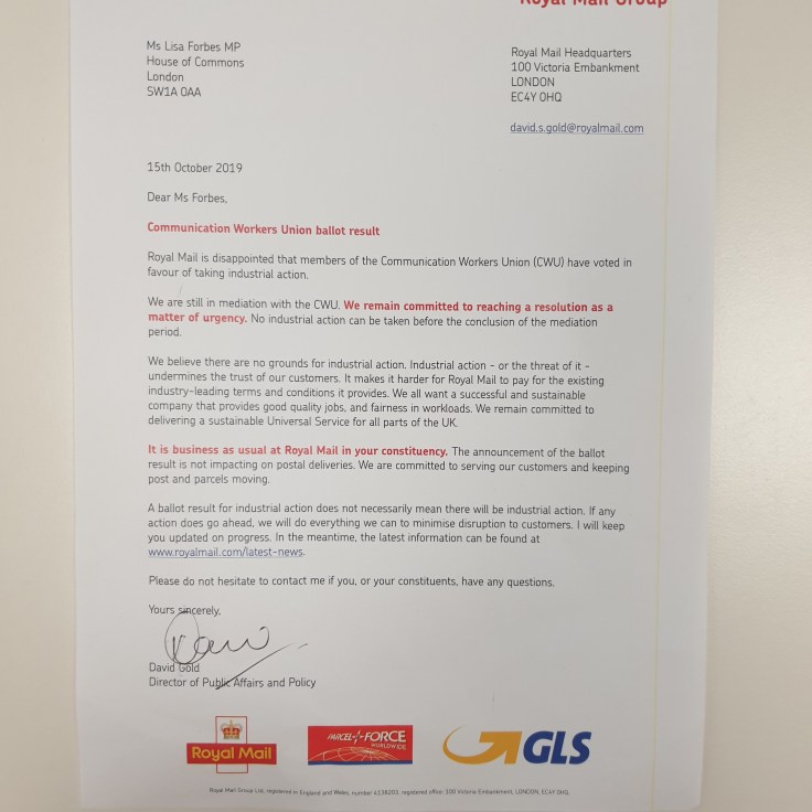 Letter in support of postal workers from Lisa Forbes Labour MP for Peterborough #WeRiseAgain Please see below a letter of support for CWU Eastern No 5 workers in in response to a propaganda letter from Royal Mail. Share this with your friendsTweet Click to print (Opens in new window) Print Click to email a link to a friend (Opens in new window) Email Click to share on WhatsApp (Opens in new window) WhatsApp Click to share on Bluesky (Opens in new window) Bluesky Like Loading... Related Leave a comment Cancel reply Δ
