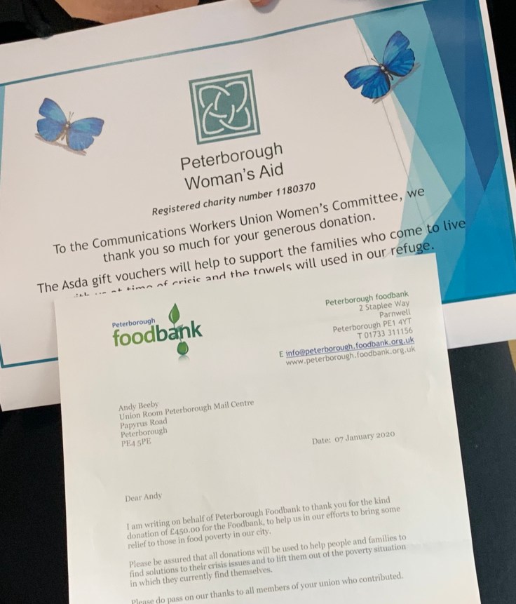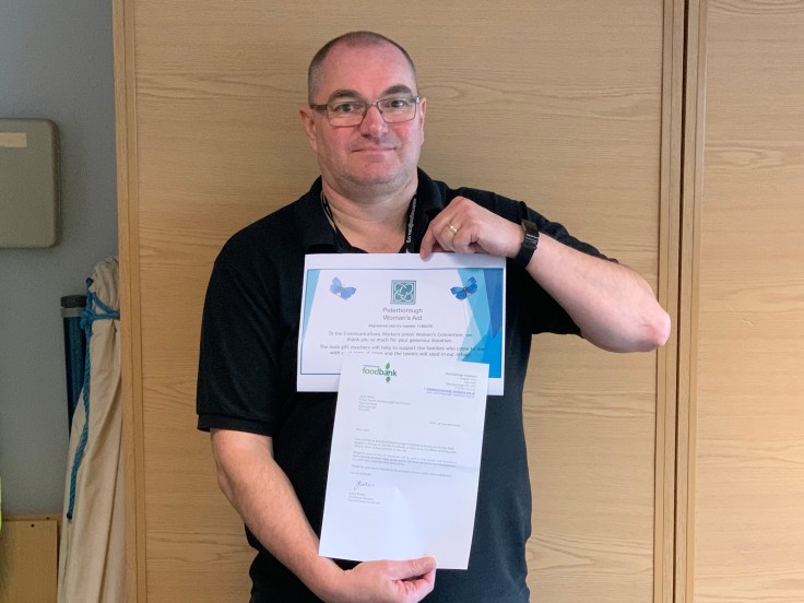 Eastern No5 Branch Secretary & Political Officer Andy Beeby with letters of thanks from Peterborough Women’s Aid and Peterborough Foodbank for the Branches donations