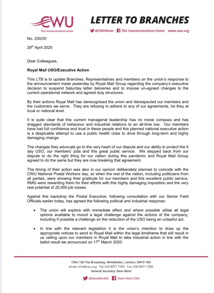 When the Coronavirus Covid-19 epidemic broke within the UK I wrote to Royal Mail requesting to engage on the potential impact and to discuss measures which could be put in place to ensure we could protect our members, Royal Mail employees.