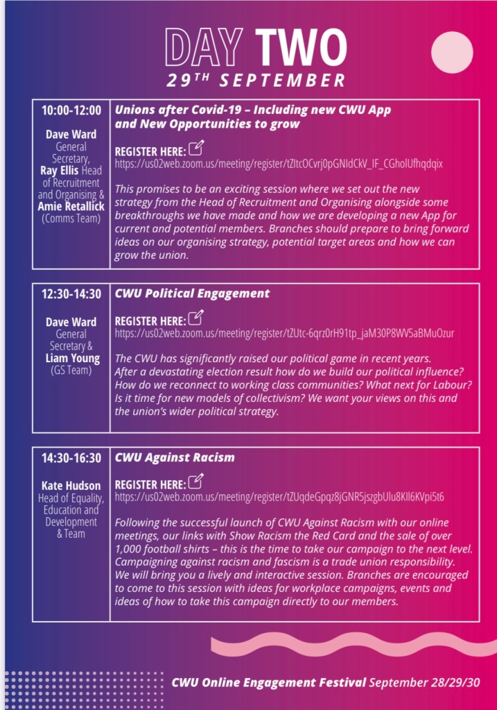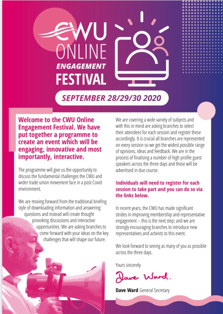 On 28/29/30 September the CWU will become the first ever union to hold an online engagement festival. A huge range of topics will be covered. This is the initial programme. You have to register for each session.