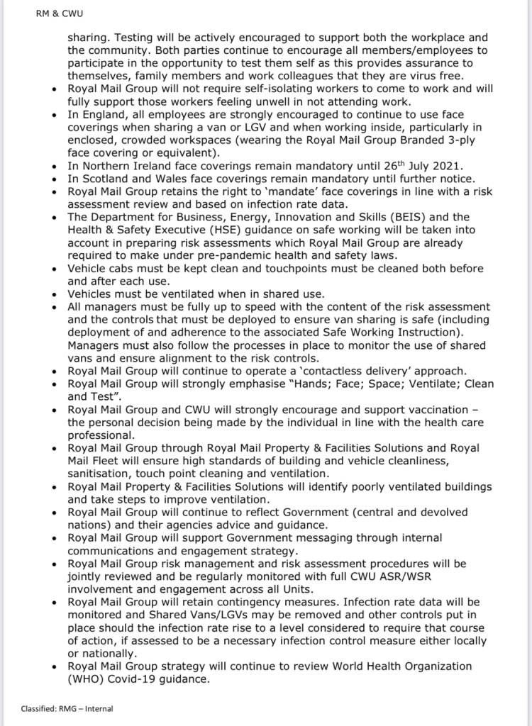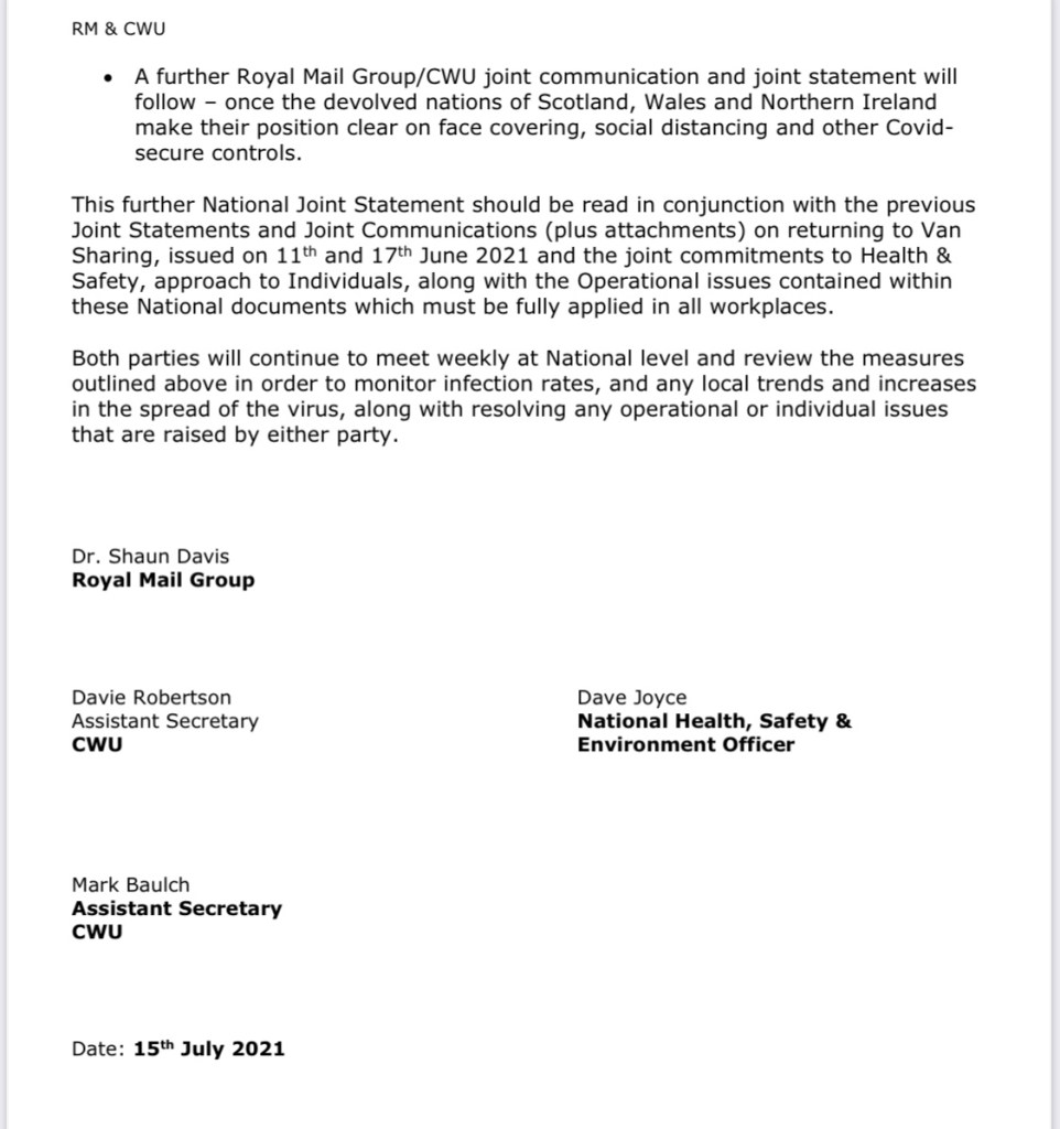 - Royal Mail Group will re-introduce shared vans and LGVs subject to the respective legislative changes appropriate to that part of the United Kingdom along with appropriate safety controls and safe working instructions being applied, in consultation with CWU Area and Workplace Safety, Delivery and Distribution Representatives.