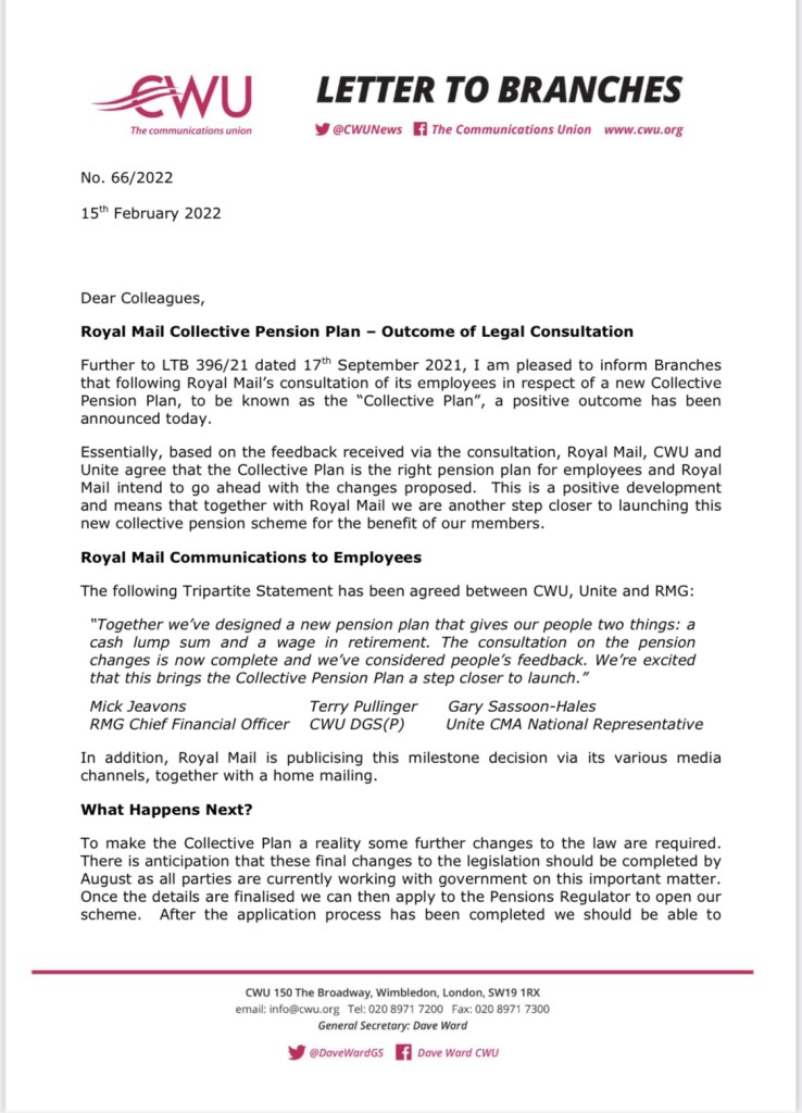 Important update on Royal Mail Group pensions 15/2/22 Important update on Royal Mail Group pensions from DGSP Terry Pullinger. Share this with your friendsTweet Click to print (Opens in new window) Print Click to email a link to a friend (Opens in new window) Email Click to share on WhatsApp (Opens in new window) WhatsApp Click to share on Bluesky (Opens in new window) Bluesky Like Loading... Related Leave a comment Cancel reply Δ