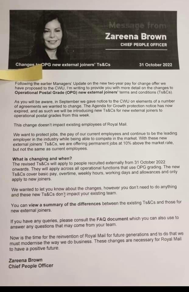 Below is a copy of the new offer that the business made earlier this afternoon. As you can see it’s an absolute insult to the CWU and the sacrifices that you’ve made, as for the pay offer of 7% over two years and a lump sum worth 2% (not consolidated) it’s pathetic against the current inflation rate running at over 10%. The extra 3.5% for this year will not be backdated. The 2% lump sum is only when you’ve agreed to changes in your workplace.