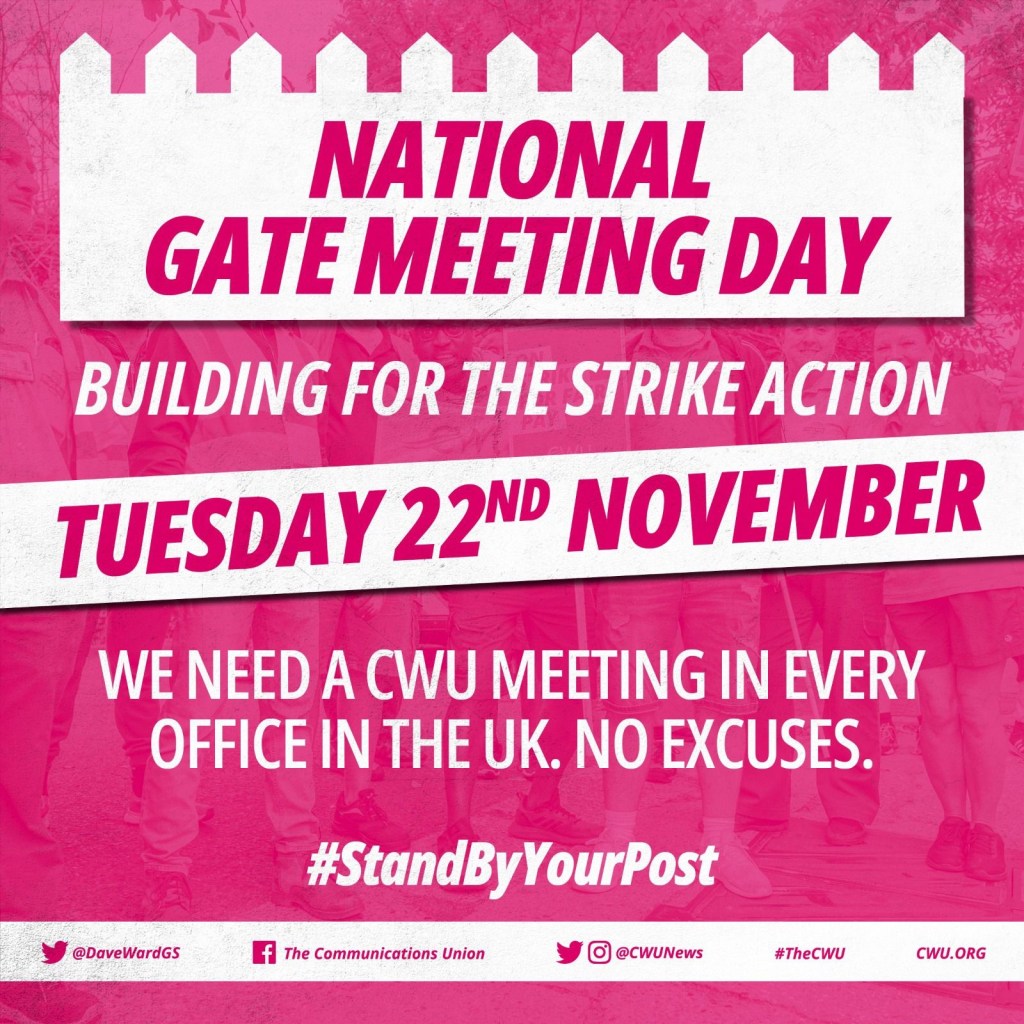 Following on from last night’s successful CWU Live event, we have called National Gate Meeting Day on Tuesday. We are asking every CWU representative to make this a priority commitment. It is crucial a meeting is held in every single workplace. We have requested that our Officers, PEC and Field Officials are out in force on Tuesday to support the work of our branches.