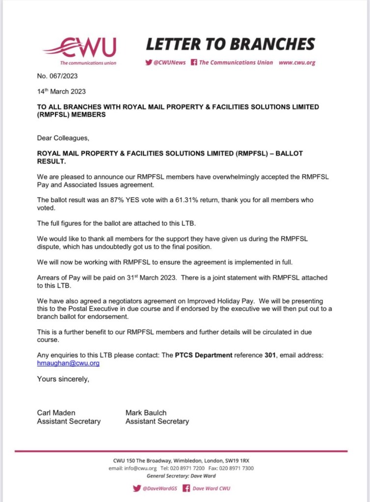 Any enquiries in relation to this LTB should be addressed to Davie Robertson, Assistant Secretary, email: dwyatt@cwu.org quoting reference 301.12.