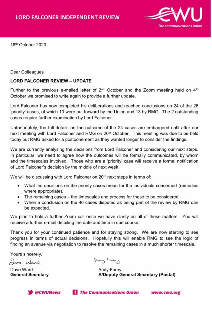 Pleases find attached a CWU members’ communication that we would ask you to distribute today as widely as possible.