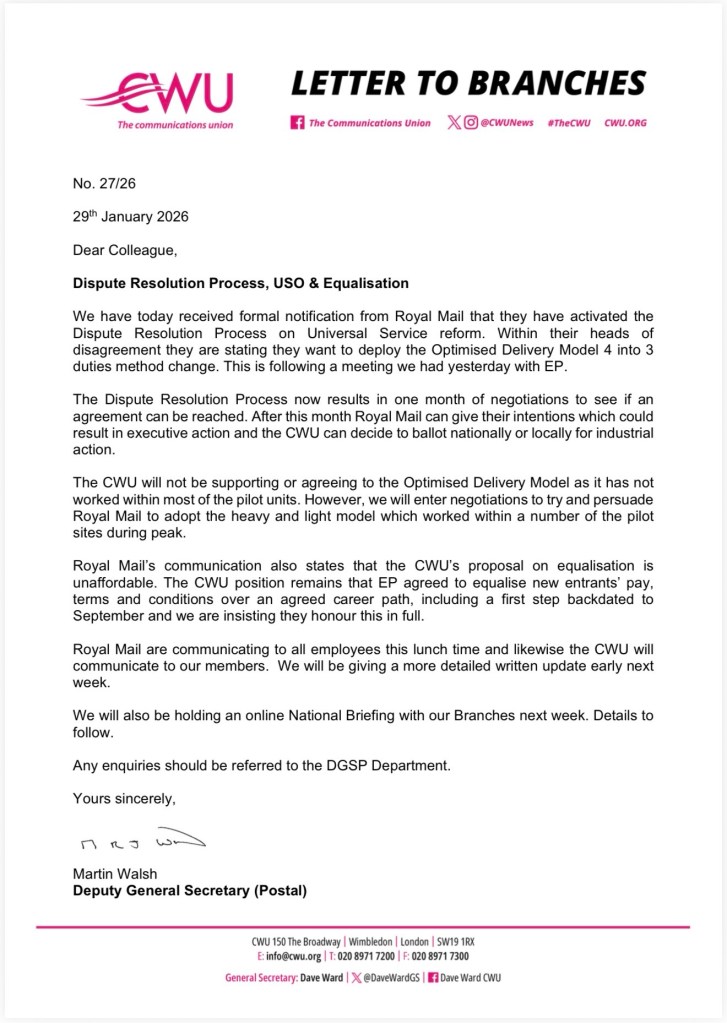 The CWU will not be supporting or agreeing to the Optimised Delivery Model as it has not